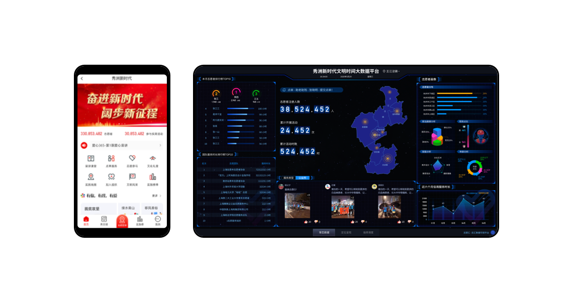 移动端集点单服务、志愿参与,文化礼堂等各种功能,大屏综合展示新时代的各种数据,便于统筹协调各种资源。